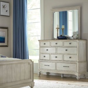 Heavily molded top frame in a sunwashed finish works beautifully over any dresser. Sun Washed, Driftwood, Denim