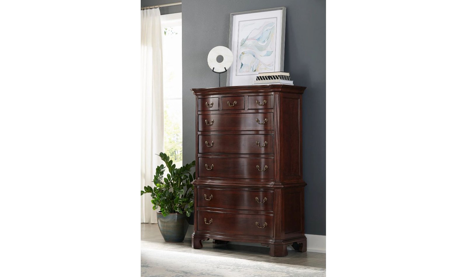 Chest on chest comes with eight drawers, bracket feet, reeded pilasters, framed end panels, clipped corners and inlays to keep with the traditional styling of today’s homes. Classic Antique Cherry Finish