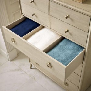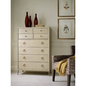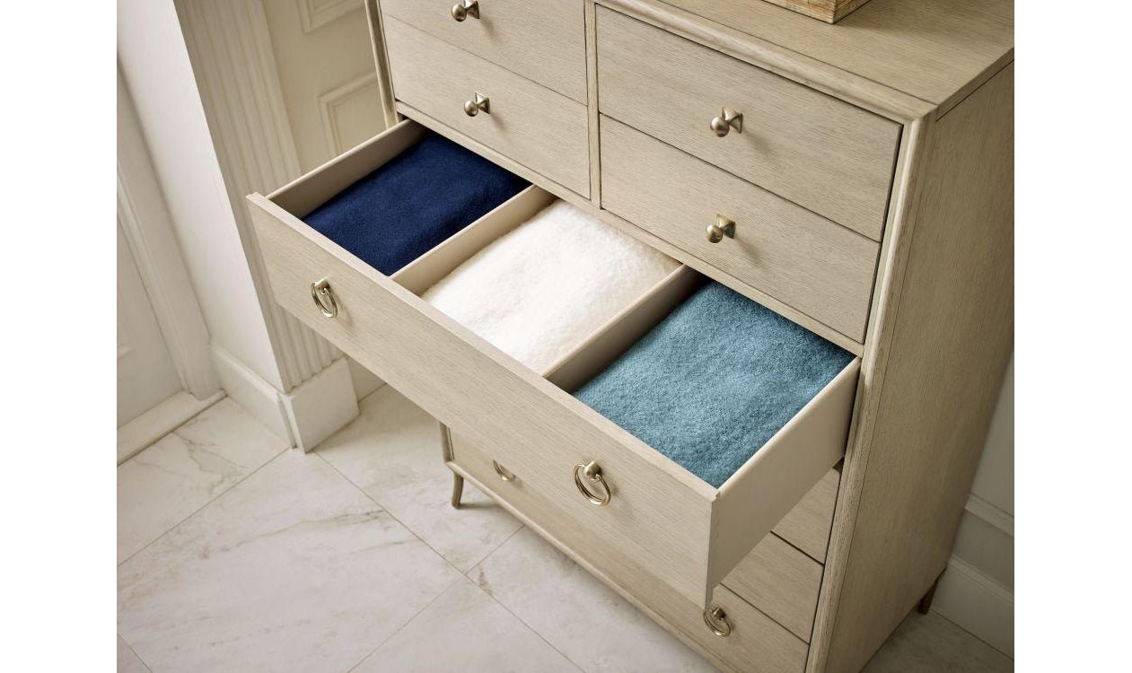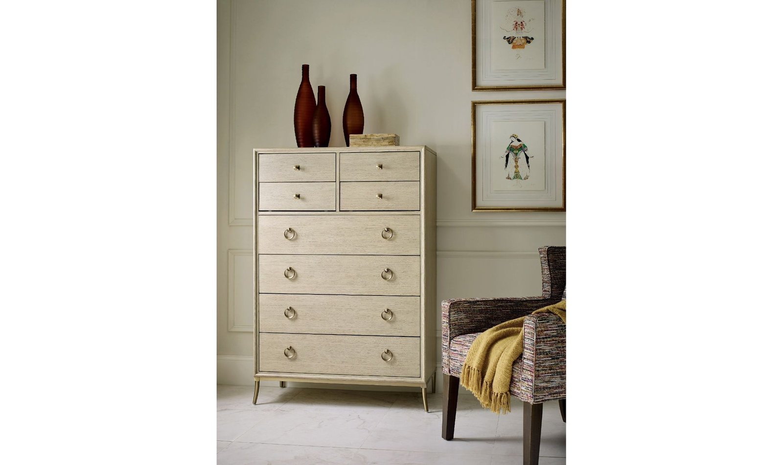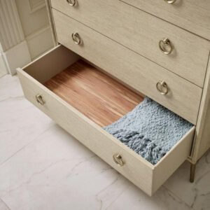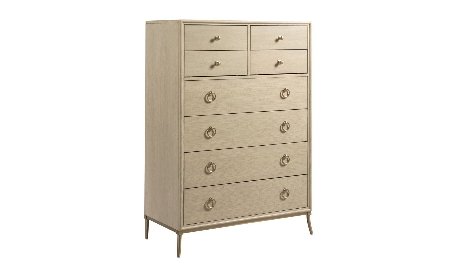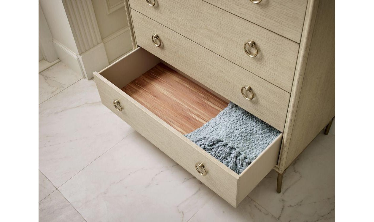 The Carson chest features eight drawers. The bottom drawer is Cedar lined. Adjustable levelers and hand holds in the back of the case. ALABASTER(OAK VENEER); RICH CLEAR LAQUER(AMARA EBONY VENEER); BRASSY CHAMPAGNE(METAL)