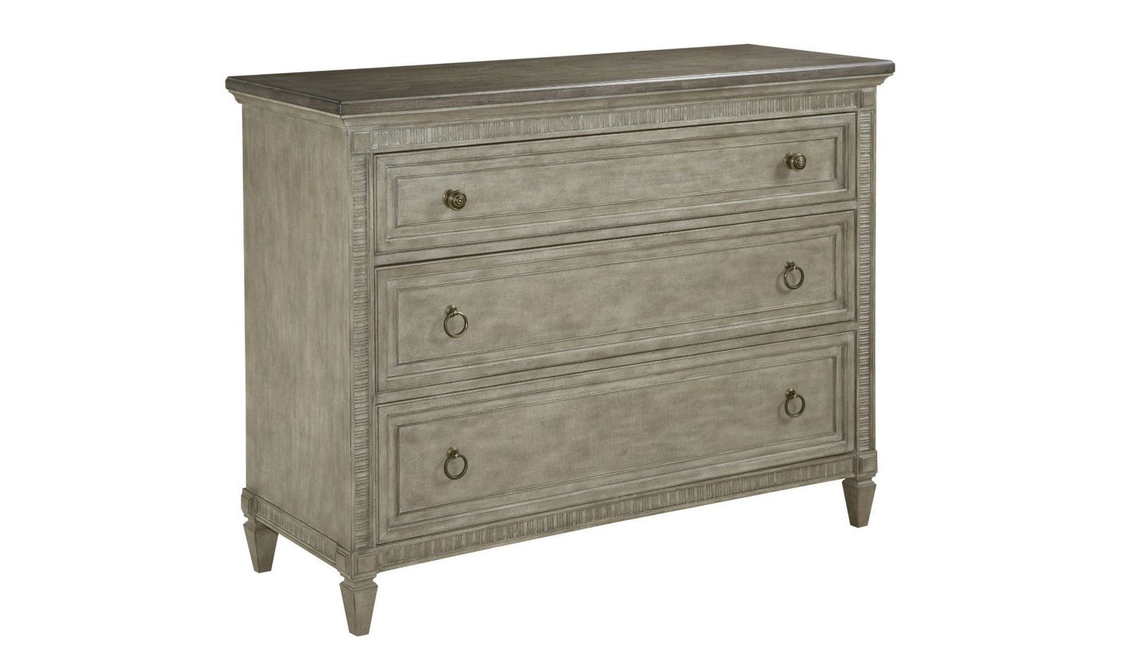 Bellman drawer chest is perfect for the smaller spaces and has three drawers for ample storage. Bottom drawer is cedar lined and case is finished off with dentil moulding and reeding. Versaille