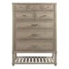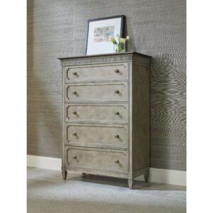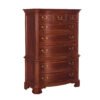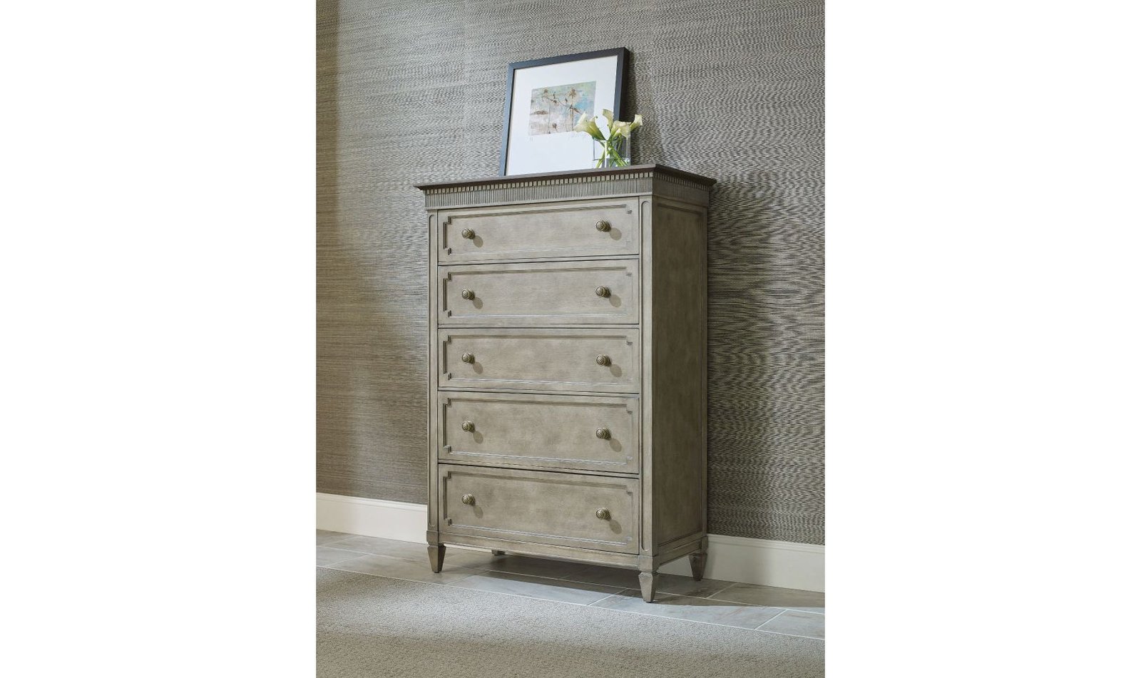 Architecturally inspired pilasters with framed drawer fronts and five drawers make this a must have. Beautifully carved dentil moulding and reeded top case with mocha elm finish top. Versaille