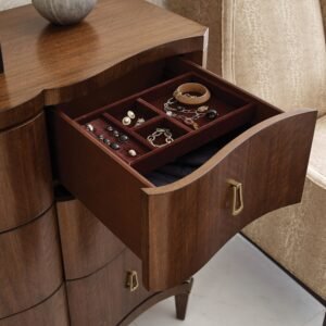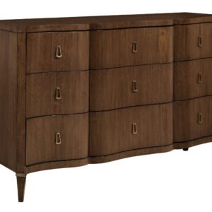 The Richmond dresser features nine drawers. The bottom three drawers are Cedar lined. A brown jewelry tray is provided in the top right drawer. Adjustable levelers; hand holds in the back of the case. Warm Brown