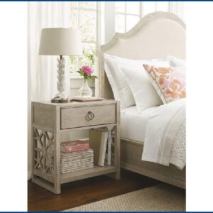 Open nightstand with grid work on the sides, open shelf and drawer for storage will complete any bedroom. Oyster