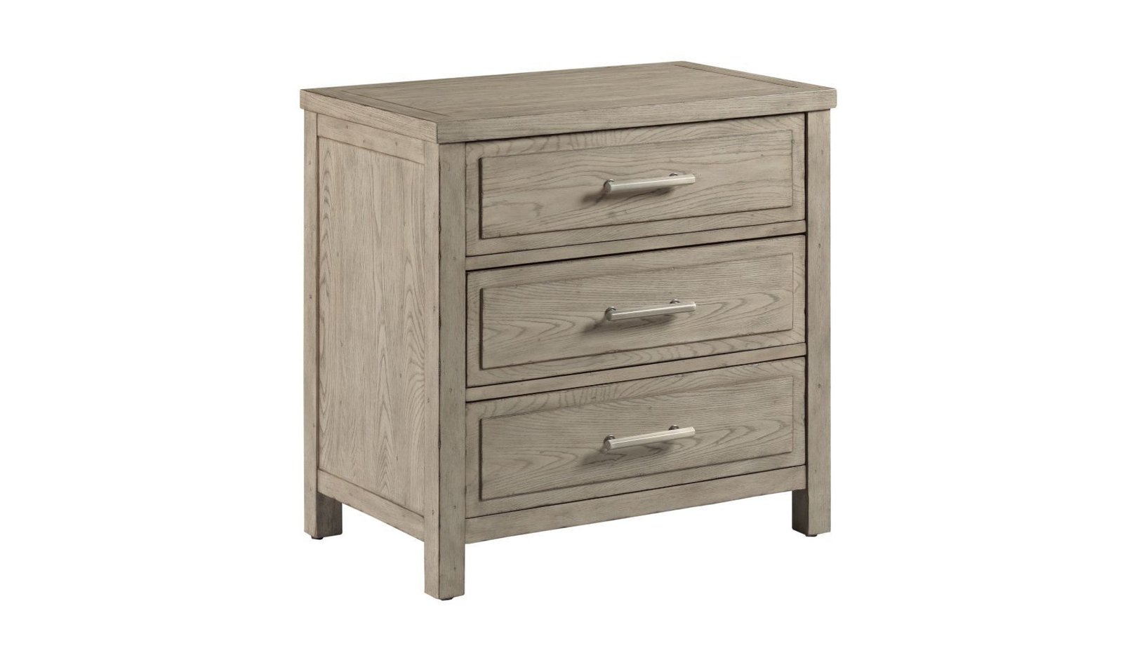 Baker night stand is the perfect side piece for any bedroom setting. Three drawers, adjustable levelers and a two outlet plug with USB port. Bottom drawer is cedar lined. Aged Taupe